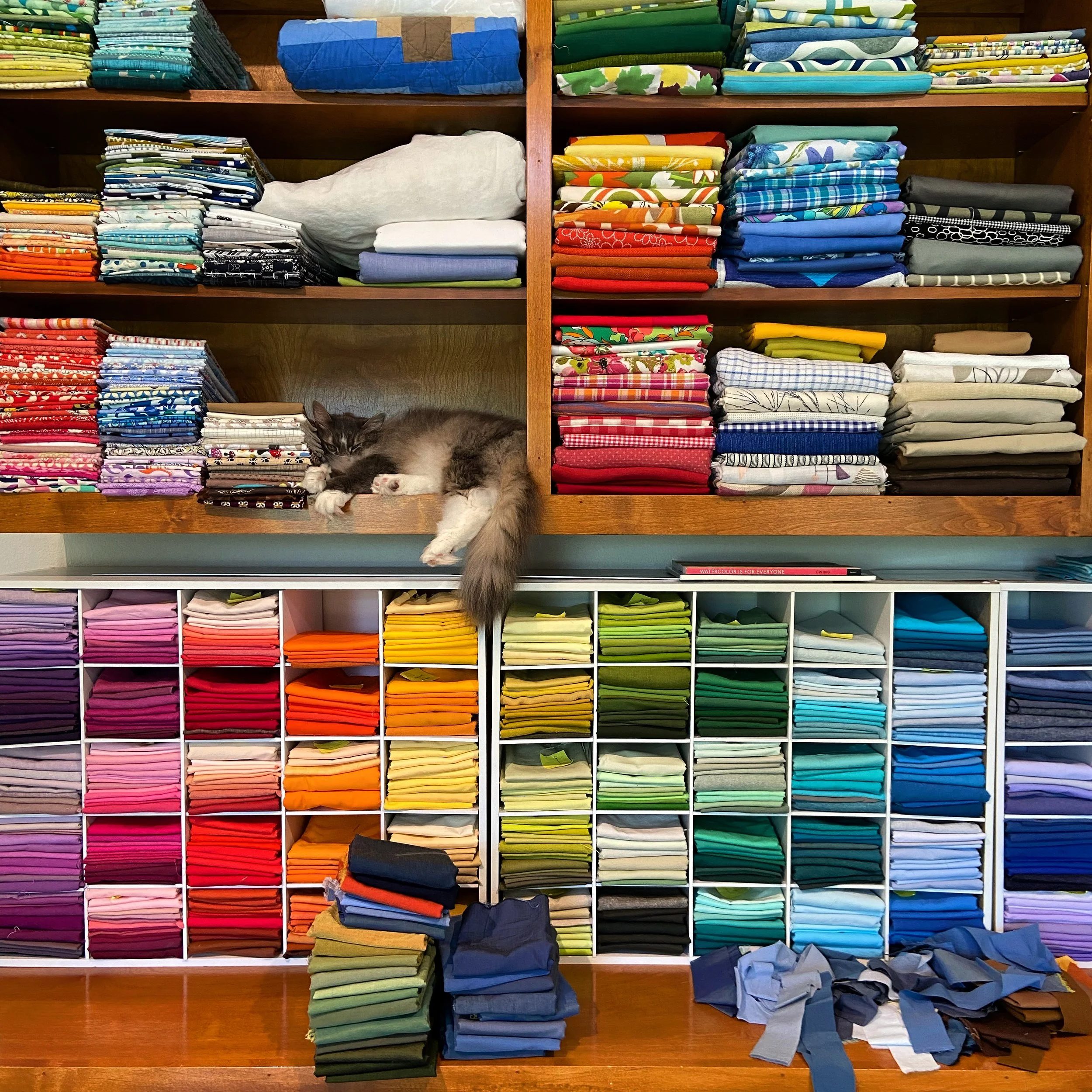 I piece all of my quilts so that I can put them in the washer and dryer which develops the beautiful crinkles that create depth and texture. I use a sewing machine, cotton batting, cotton thread, and cotton and linen fabric.